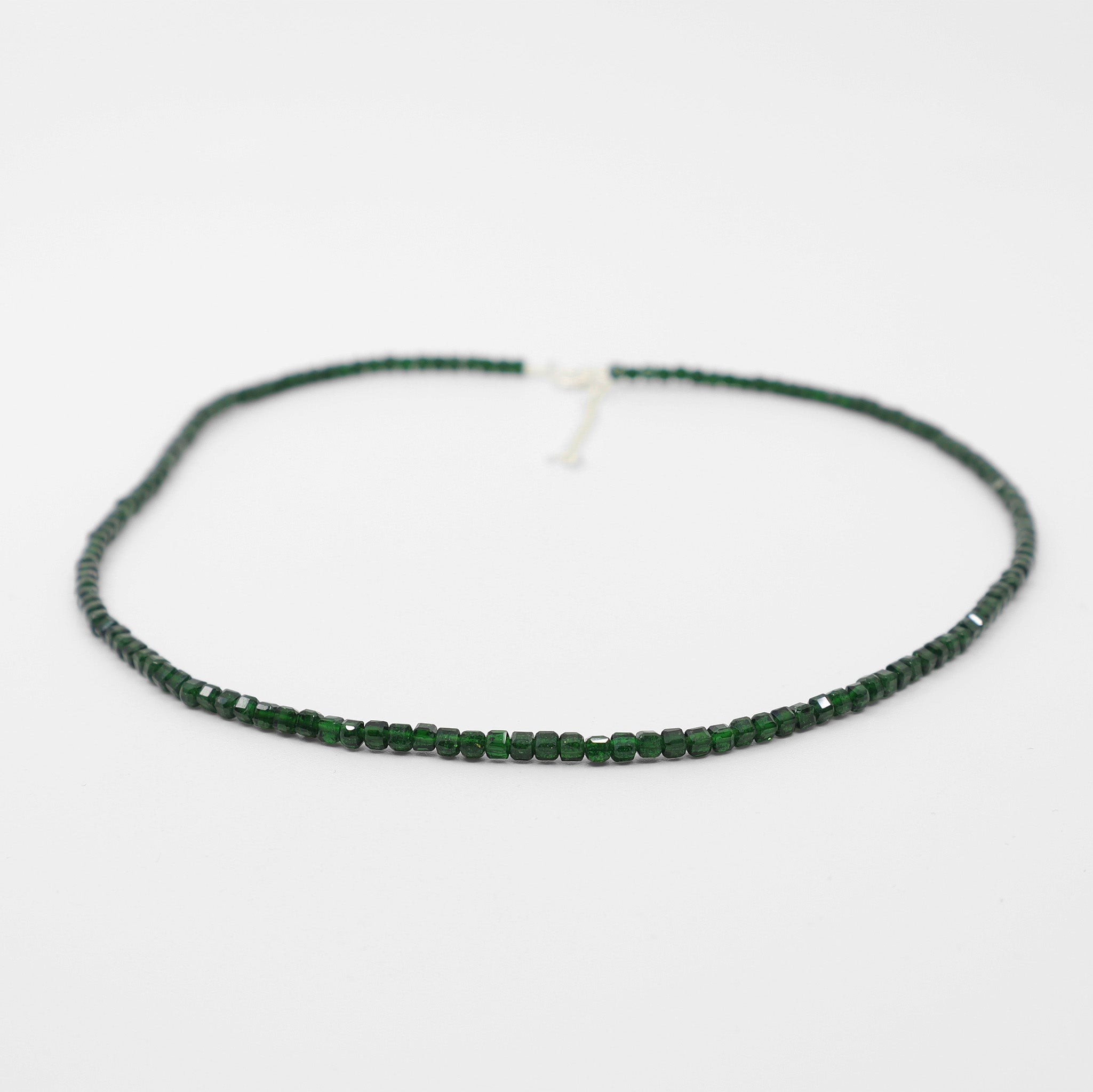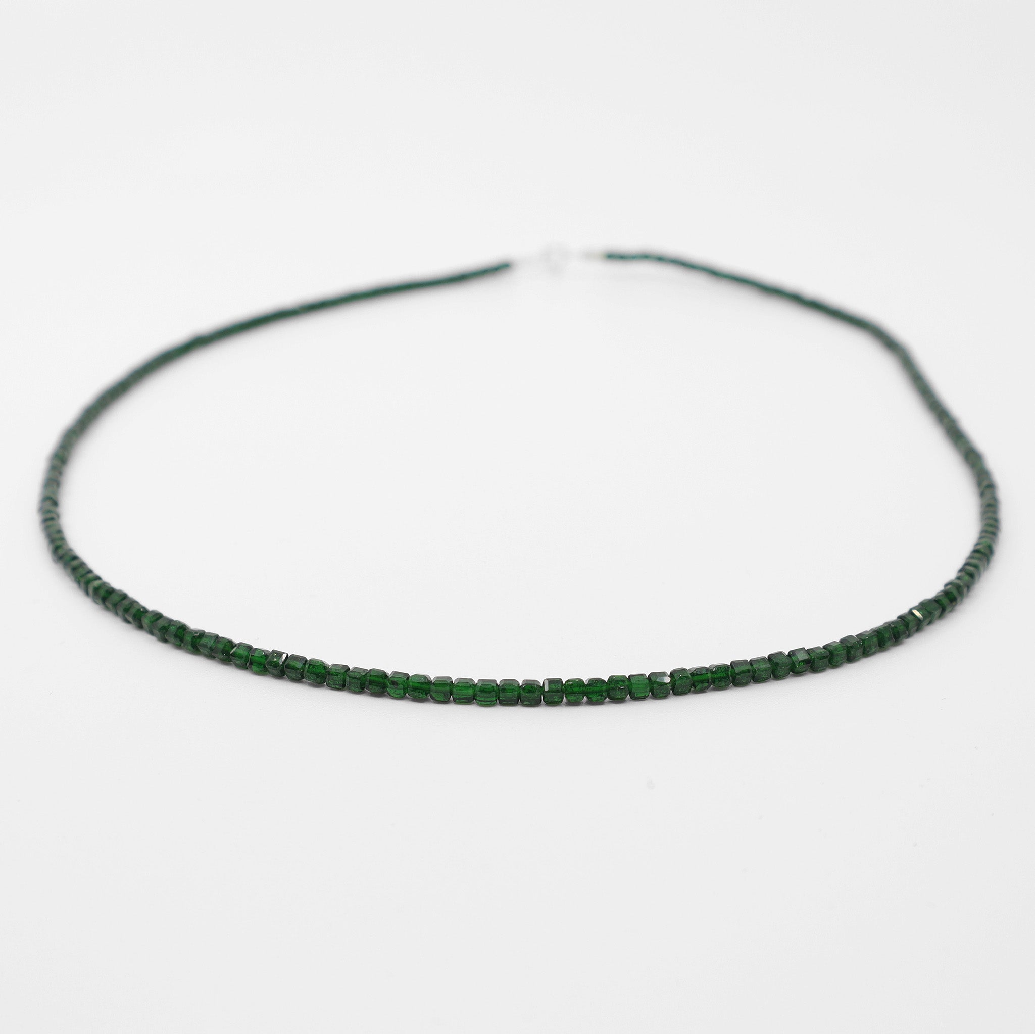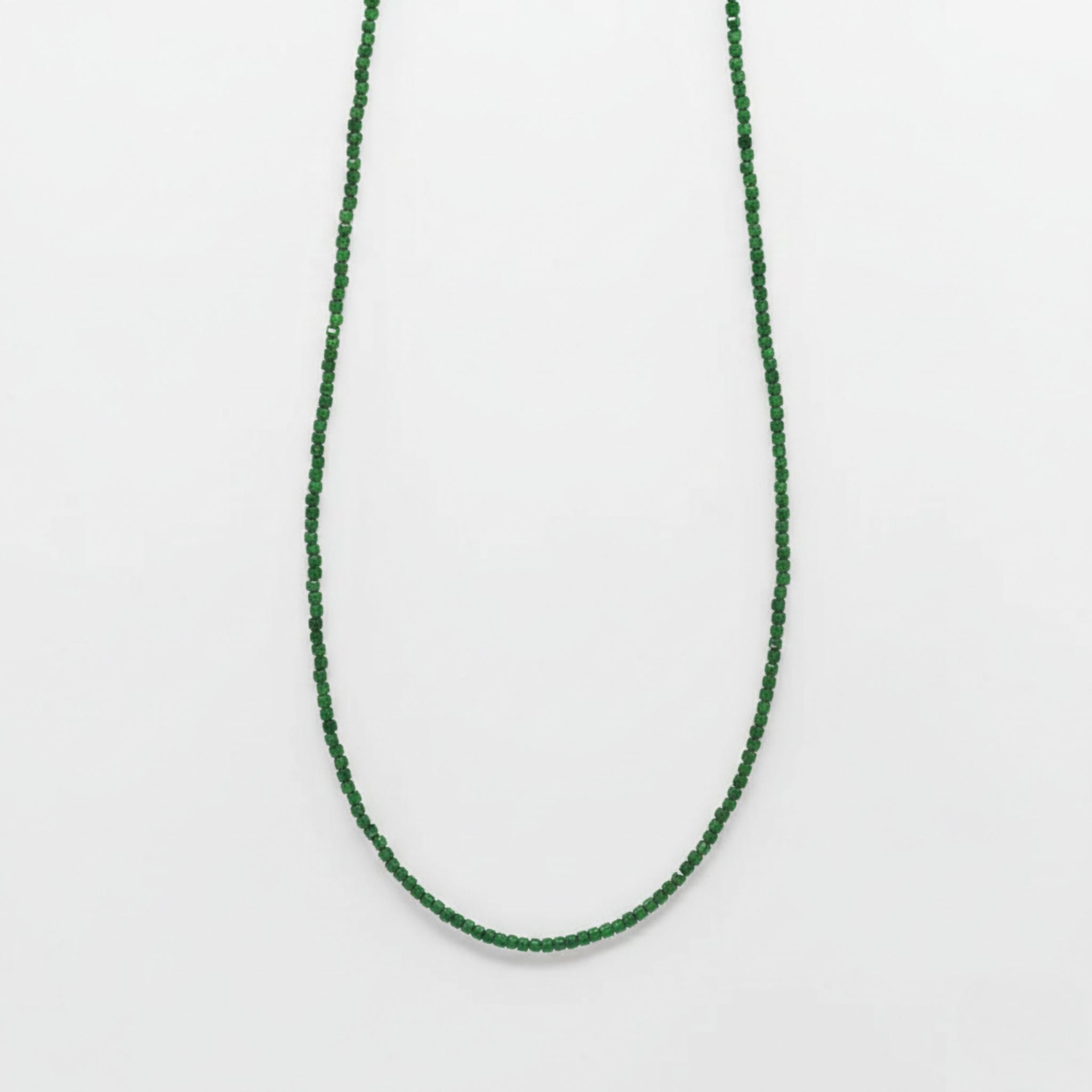 Colar com contas de 3mm de Jade Esmeralda facetada com fecho em prata 925. A pedra Jade Esmeralda atrai harmonia, prosperidade e equilíbrio emocional, sendo símbolo de proteção e bem-estar.