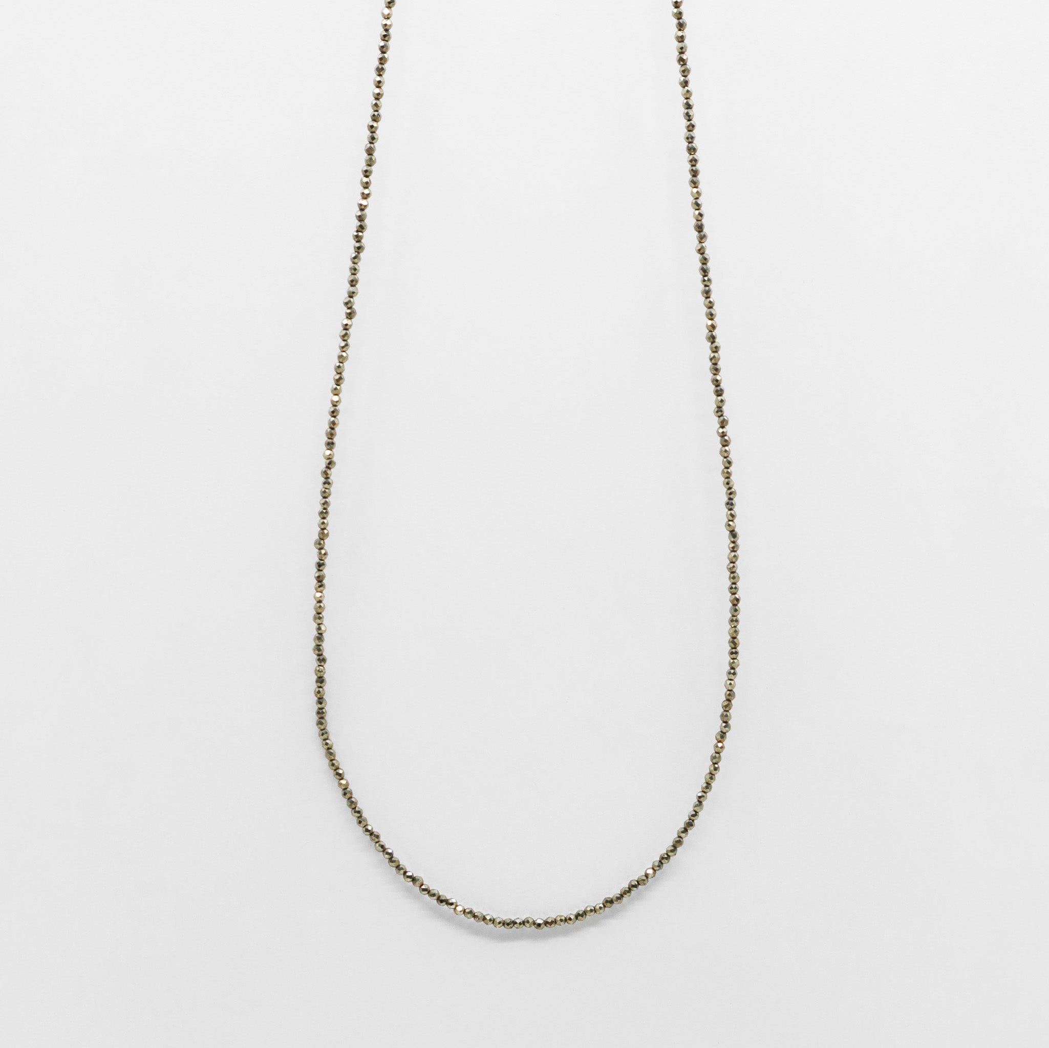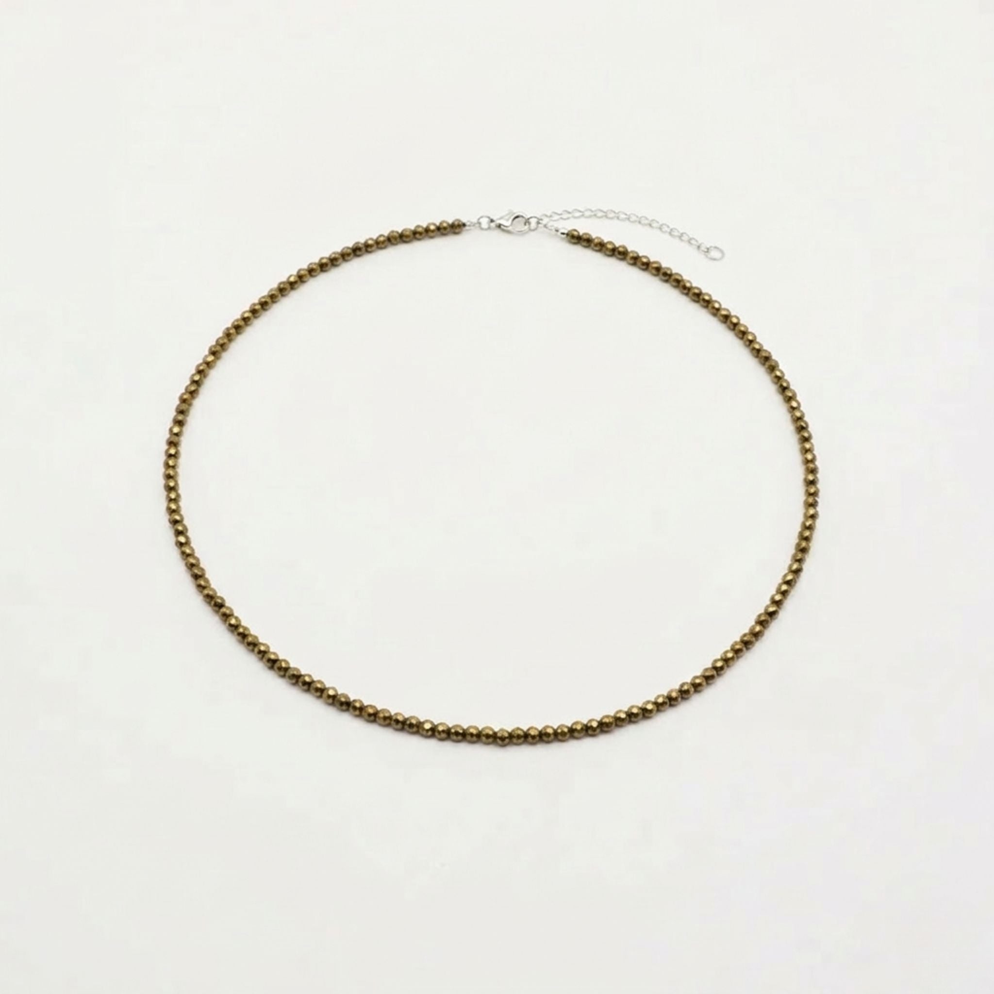 Colar com contas de 3mm de Pirita facetado com fecho em prata 925. A Pirita é uma pedra de abundância, ajudando a atrair riqueza e confiança, além de estimular a autoestima e a coragem.